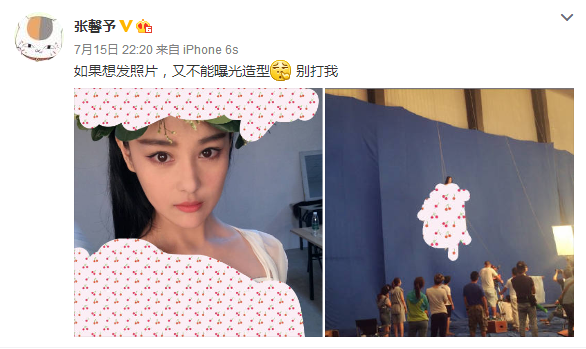 张馨予昨日(7月15日)在微博发布自己拍戏时的照片,然而由于造型需要保密,她在自己的发型和服装上涂满萌哒哒的马赛克。不过虽然如此,还是能看到她满头的树叶子,这是戴了个花环么?